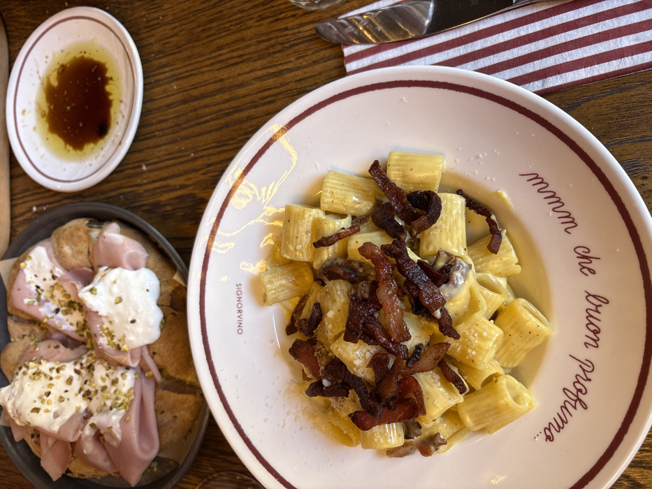 The image displays a close-up, elevated view of a wooden table laden with Italian cuisine. In the foreground, a white ceramic plate with a red rim holds a generous serving of pasta, likely rigatoni, coated in a creamy, yellow sauce and topped with numerous dark, crispy pieces of guanciale or bacon and a dusting of grated cheese. The plate's rim features the brand name "SIGNORVINO" at the top and the Italian phrase "mmm che buon profumo..." (mmm what a good smell...) handwritten along the bottom curve. To the upper left, partially visible in a dark, round metal pan, is a circular baked item resembling focaccia or bread, divided into sections. Each section is topped with folded slices of light pink mortadella ham, dollops of white burrata or ricotta cheese, and sprinkled with finely chopped green pistachios. To the upper right, a small white saucer with a red rim contains a pool of golden olive oil with dark brown balsamic vinegar swirled within it. A red and white striped napkin and a silver knife are visible on the right side of the table, adjacent to the pasta plate. The environment is a restaurant setting, specifically a Signorvino establishment, one of which is located in the city of Rome, Italy. No people are visible in the frame, focusing entirely on the food and table setting.