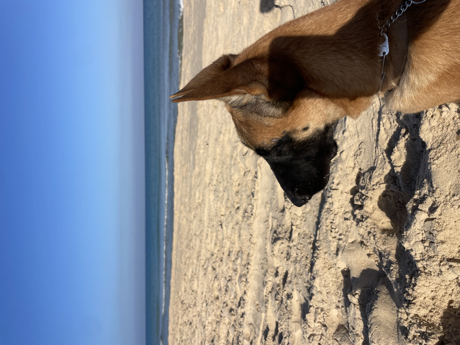 - "The image depicts a side profile view of a tan and black canine, possibly a Belgian Malinois or German Shepherd type dog, positioned on a sandy beach in Ashdod, Israel" by FM-czuIx1, licensed under CC BY 4.0