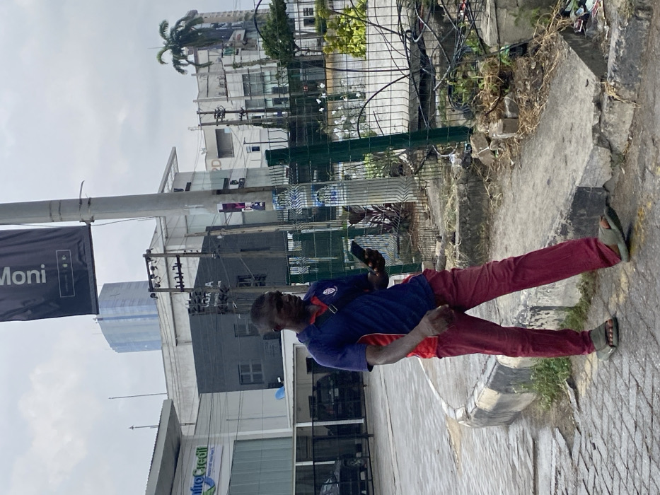 An outdoor scene in Itirin, Nigeria, depicts a dark-skinned male walking on a paved sidewalk under an overcast sky