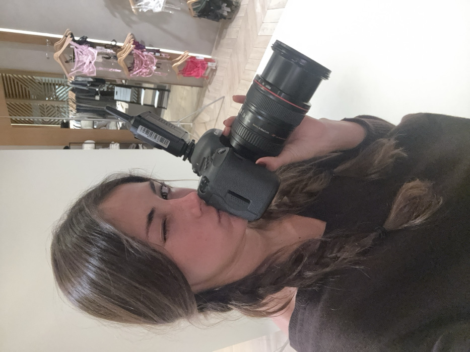 A woman with shoulder-length brown hair and dark eyes holds a large professional camera to her cheek. She is wearing a brown top. The camera has a large black lens. Behind her is a display of lingerie on hangers, reflected in a mirrored wall. The background appears to be the interior of a retail store.