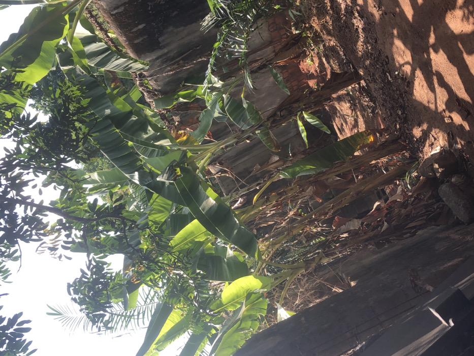 The image presents a sunlit outdoor scene in Ifitedunu, Nigeria, dominated by dense tropical vegetation. Numerous banana trees with large, vibrant green leaves and visible brown, dried stalks comprise the primary foliage, with additional green plants, including palm-like fronds, interspersed throughout. In the background, a weathered concrete or block wall, partially obscured by the dense growth, shows areas of exposed reddish brick at its base. A dark, vertical wooden structure or post is prominent on the far left. The ground consists of reddish-brown soil, unevenly illuminated by direct sunlight, which casts distinct shadows from the surrounding plants and scattered organic debris. No individuals, animals, actions, or interactions are visible within the frame.