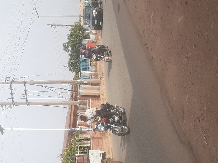 Two motorcyclists traverse a paved road. One wears a white shirt and cap, the other a yellow shirt and carries an orange container. Buildings and metal fences line the road's edge. Utility poles with numerous wires stand tall. A dark-colored vehicle is parked on the side. The sky appears bright and overcast. The road surface varies in color from light grey to brown.