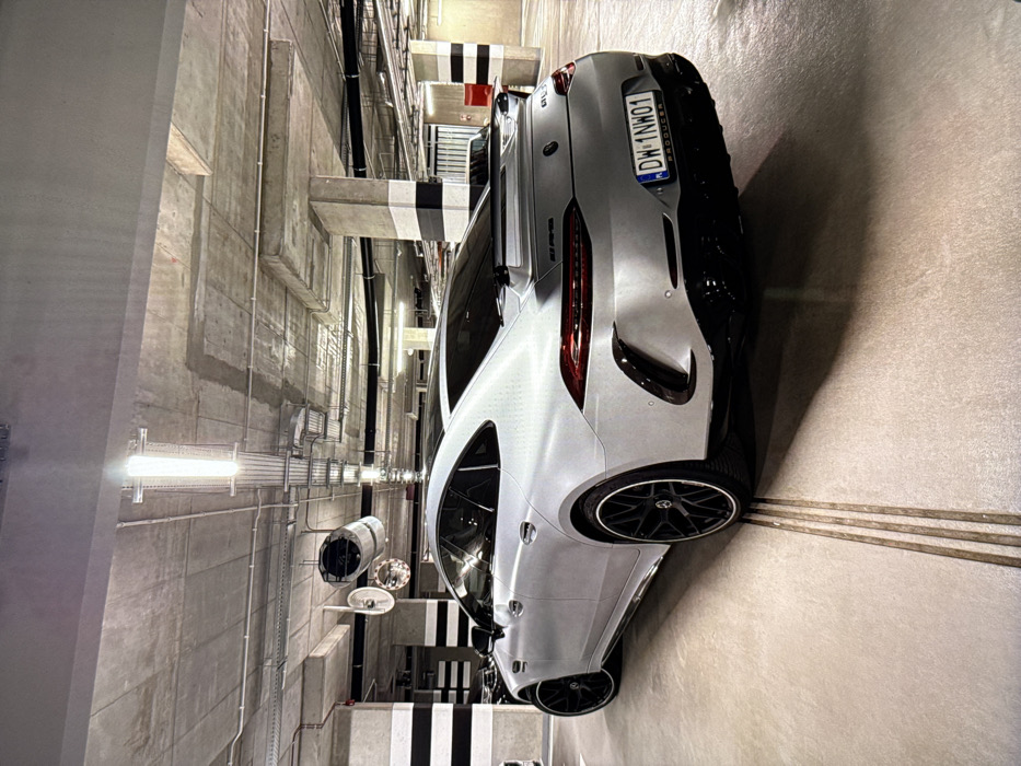 A sleek, silver Mercedes-AMG GT Black Series dominates the frame. It is parked in what appears to be an underground parking garage. The car's rear is prominently displayed, with a visible license plate and distinctive tail lights. The surrounding architecture features concrete walls, industrial lighting, and striped pillars, emphasizing the car's modern and powerful aesthetic within the stark environment.