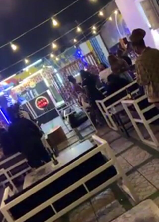 The video depicts an outdoor nighttime scene, likely at a bar or restaurant, with multiple people present