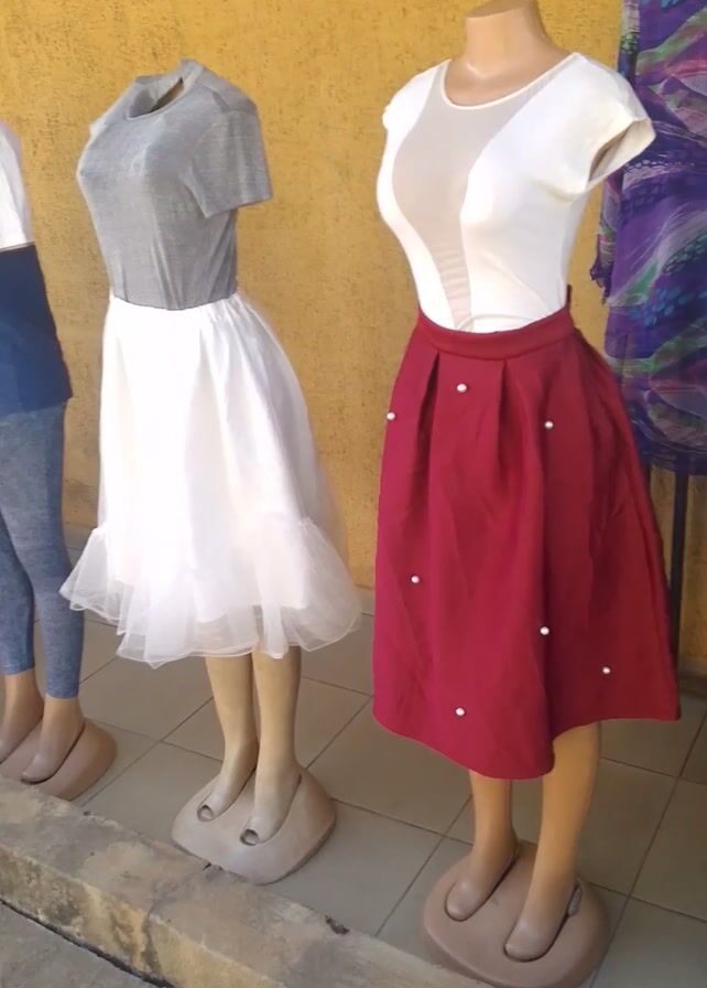 four female mannequin torsos and legs, arranged vertically against a yellow wall. Each mannequin is dressed in different clothes: one in a white top and maroon skirt with pearl accents, another in a gray top with a white tulle skirt, another in a white and blue outfit with leggings, and the last in a patterned top and maroon skirt. The mannequins are standing on beige, shoe-like platforms. The scene appears to be outdoors, possibly in front of a clothing store, with a tiled floor visible. The camera slowly pans upwards to show all the mannequins.