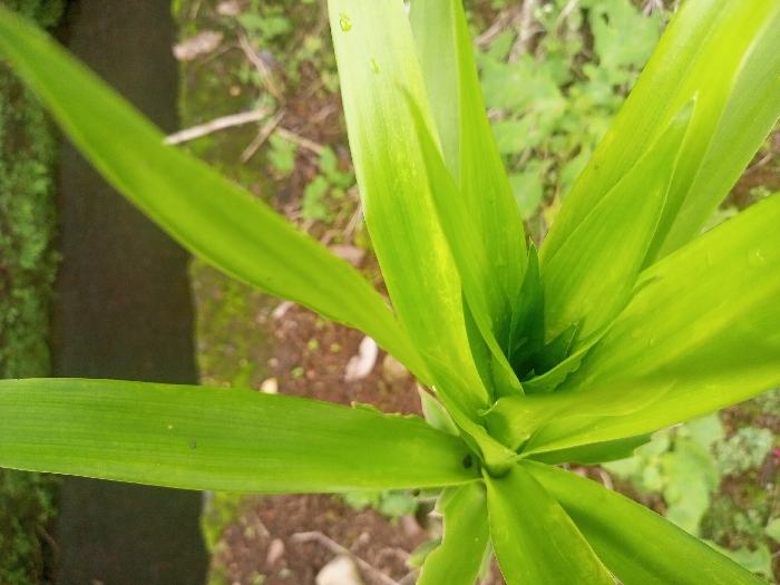 This image depicts a close-up, overhead view of a vibrant green plant, likely a herbaceous perennial, situated in Ciherang, Indonesia. The plant features multiple elongated, broad leaves with pointed tips, arranged in a spiraling or rosette pattern. Newer, smaller leaves emerge tightly from the central stalk. The leaves exhibit various shades of green, with some showing lighter green or yellowish streaks, possibly due to variegation or nutrient status. Several leaves bear small, clear water droplets. To the left of the plant, a dark, shallow channel or ditch is visible, its edges covered in moss and darker vegetation. The background, particularly to the right and upper portions of the image, consists of blurred green foliage and reddish-brown soil, indicating a natural outdoor environment. No human figures or discernible actions are present.