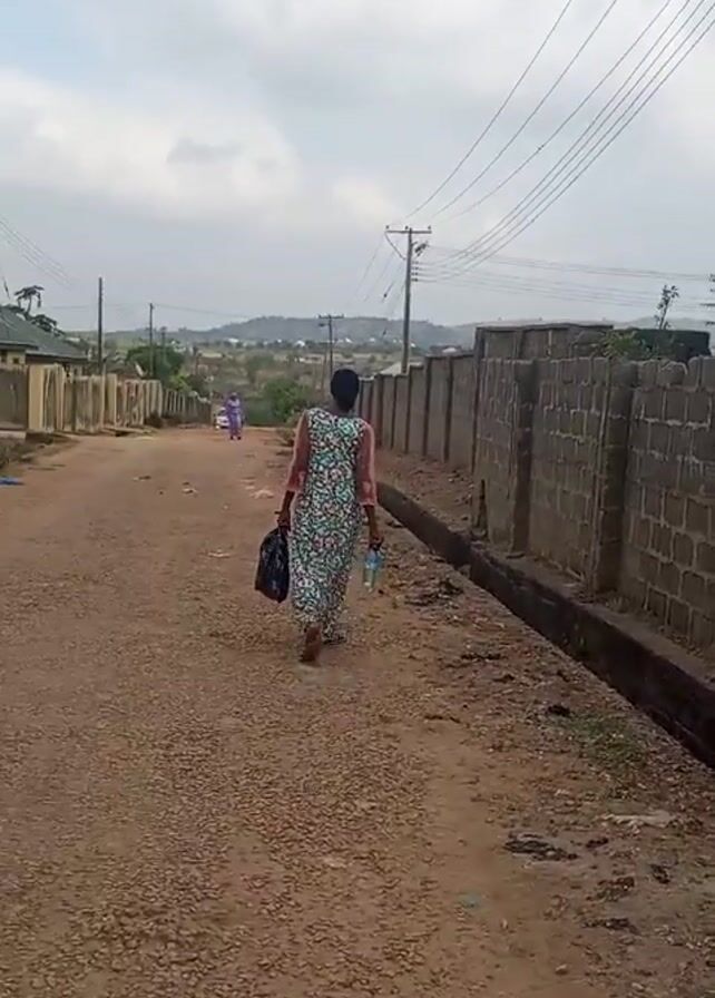 A woman wearing a long, colorful patterned dress and carrying a black bag and a water bottle walks away from the camera down a dirt road in a residential area. The road is bordered by walls and drainage ditches. In the distance, another woman in a purple dress is walking away from the camera, and a white car is visible. Overhead, power lines stretch across the sky, which is mostly overcast.