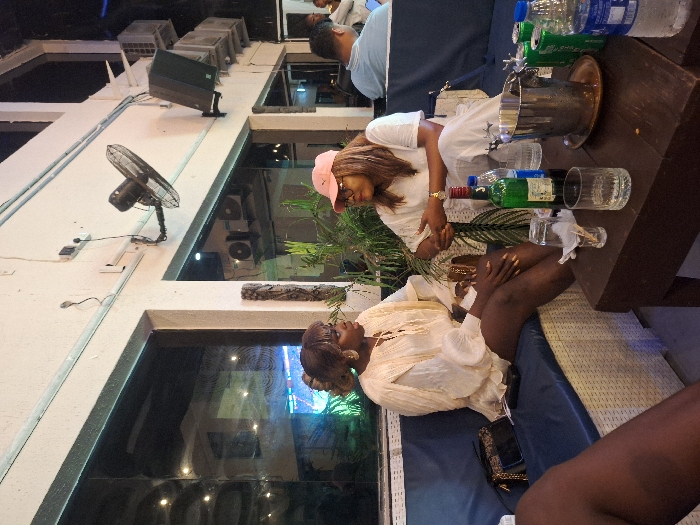 Two women dressed in white sit on a blue bench beside a dark wooden table. On the table are bottles of water, green soda cans, an ice bucket, a wine bottle, and glasses. Behind them is a multi-paned window with some sort of decorations above it. On the left is an air conditioning unit and a wall-mounted fan.