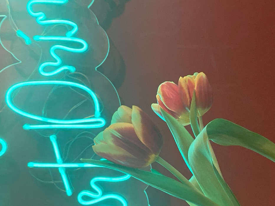 The scene, located in Budva, Montenegro, features two tulips positioned in the foreground against a reddish-brown wall. A prominent teal neon sign, mounted on a cloud-shaped acrylic panel, occupies the upper background, displaying partial cursive lettering, including 'st D'. The upper tulip, situated left of center, exhibits petals ranging from red to orange and yellow, with visible green stems. The lower tulip, positioned to the right of the upper tulip, presents similar red, orange, and yellow petals and green foliage. The neon sign emits a distinct teal luminescence, casting a glow onto the tulips and their leaves. No individuals or overt actions are depicted.