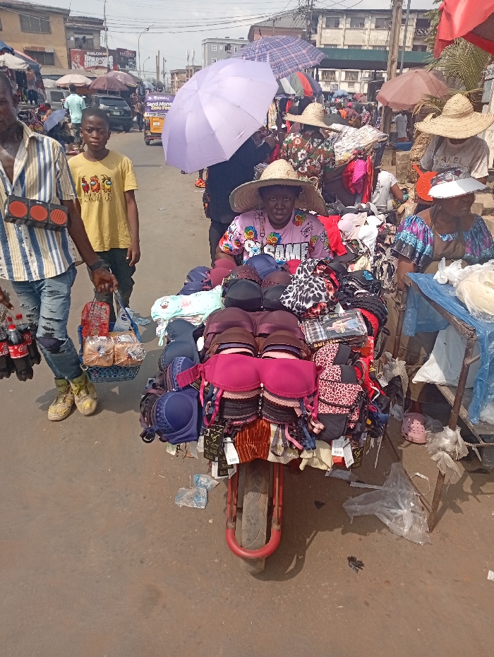 In a bustling outdoor market, a vendor sits behind a wheelbarrow piled high with bras of various colors and patterns, wearing a straw hat
