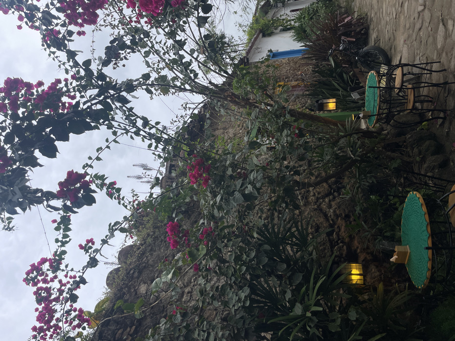 A quaint scene features vibrant pink bougainvillea framing a stone building. Lush greenery climbs the structure, interspersed with occasional red blooms. A motorcycle sits parked near outdoor seating with tables topped with bright green cushions. Decorative lanterns cast a warm glow against the textured wall. The cobblestone ground and overcast sky complete the serene ambiance.