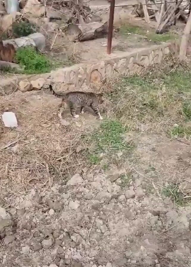 A cat walks through some grass. The cat is mostly brown and gray with some white on its paws. The cat then dips into the grass. In the background is a brown building with some materials piled nearby. There is also a ladder behind the materials. The ground in the foreground is dry and rocky.