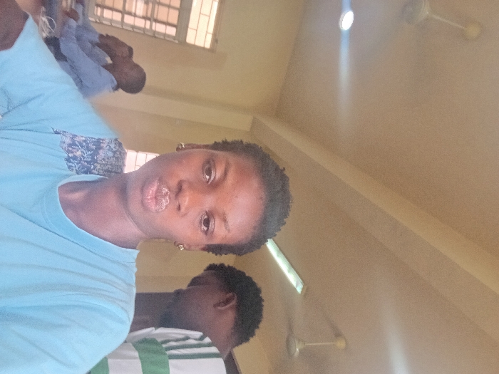 The scene depicts an indoor educational environment, likely a classroom or lecture hall, located in Ijanikin, Nigeria. In the foreground, a young Black female with short, dark, curly hair is positioned centrally, looking directly at the camera. She wears a light blue t-shirt with a visible floral pattern on her left shoulder and small gold stud earrings. Her lips are pursed. In the left background, two individuals, possibly students, are partially visible seated at desks, wearing light blue long-sleeved shirts, with their faces obscured. A multi-paned window is visible behind them, allowing natural light into the room. In the right background, a male individual with dark, short, curly hair is seen from behind, wearing a white and green striped t-shirt. The light-colored ceiling features multiple fluorescent tube lights, one of which is illuminated, and two light-colored ceiling fans.