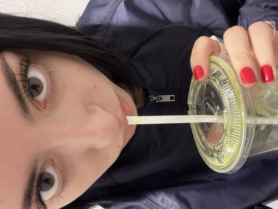 A close-up, high-angle shot depicts an individual with dark hair and brown eyes looking directly forward, their face largely occupying the upper half of the frame. The individual's lips are pursed around a white paper straw, indicating they are drinking. They are wearing a dark blue or navy jacket with a visible metallic zipper pull on the front. Their left hand, with fingernails painted bright red, holds a clear plastic cup with a domed clear lid. The cup contains residual green liquid, possibly a smoothie or matcha drink. The background is a plain, light-colored, out-of-focus surface, suggesting an indoor setting. There are no identifiable features within the image to determine a specific location within the city of London, United Kingdom.