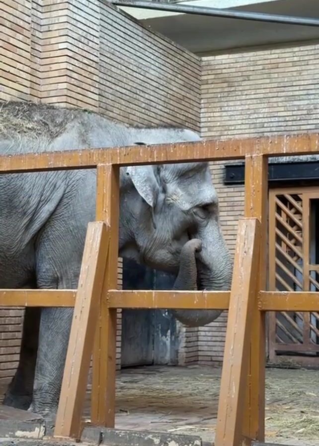 n elephant behind a wooden fence, inside what appears to be an enclosure with brick walls. The elephant has its trunk curled up towards its mouth. The enclosure has a concrete base and a pile of straw or hay can be seen behind the elephant. There is also a wooden door-like structure to the right of the elephant.