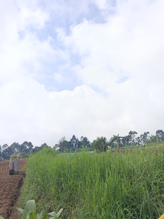A bright sky filled with fluffy white clouds dominates the scene. Below, a vibrant green field of tall grass stretches across the midground. A line of trees sits on a hill behind the grass, adding depth. A small concrete structure is on the left side, on top of reddish brown soil. Some leaves are visible on the bottom left. The image conveys a sense of nature, tranquility, and openness.
