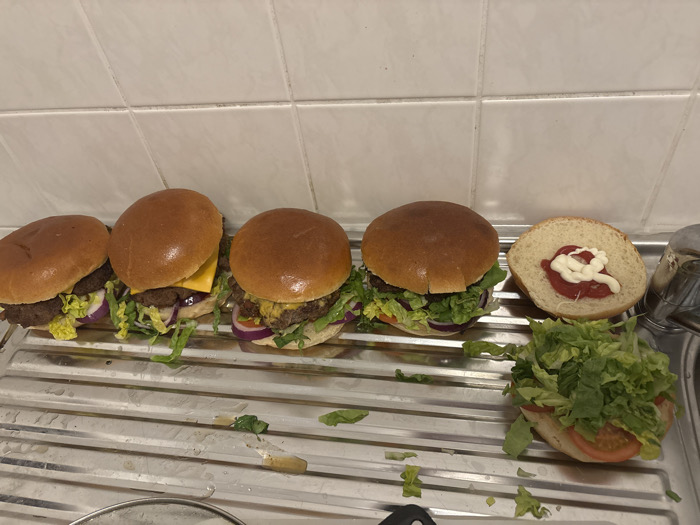 - "The scene, set within a kitchen in Dresden, Germany, displays five hamburgers or hamburger components arranged on a stainless steel sink drainer" by FM-WTbt02, licensed under CC BY 4.0