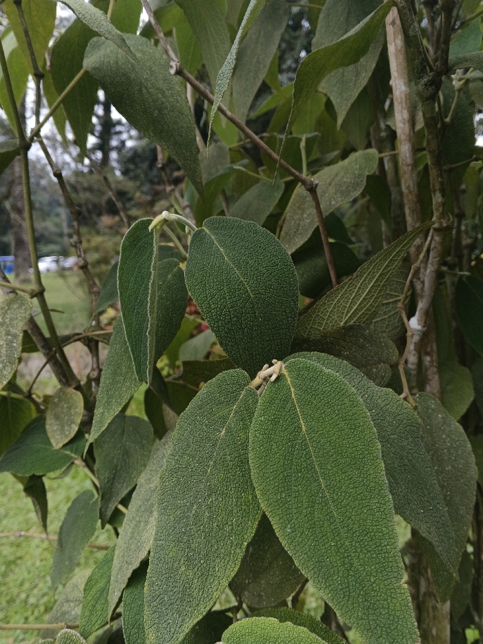 The image displays a close-up view of dense plant foliage located in Munyati, Zimbabwe. The foreground and midground are filled with numerous green, ovate to elliptical leaves, characterized by visible venation and a textured surface. Some leaves exhibit a lighter, possibly fuzzy margin. Slender, woody branches intertwine amongst the leaves. The background is out of focus, revealing blurred green grass in the lower left and dense green tree canopy or foliage further back. A faint blue object is visible in the distant left background. No individuals are present, and no actions or interactions are depicted. The scene is illuminated by natural light.
