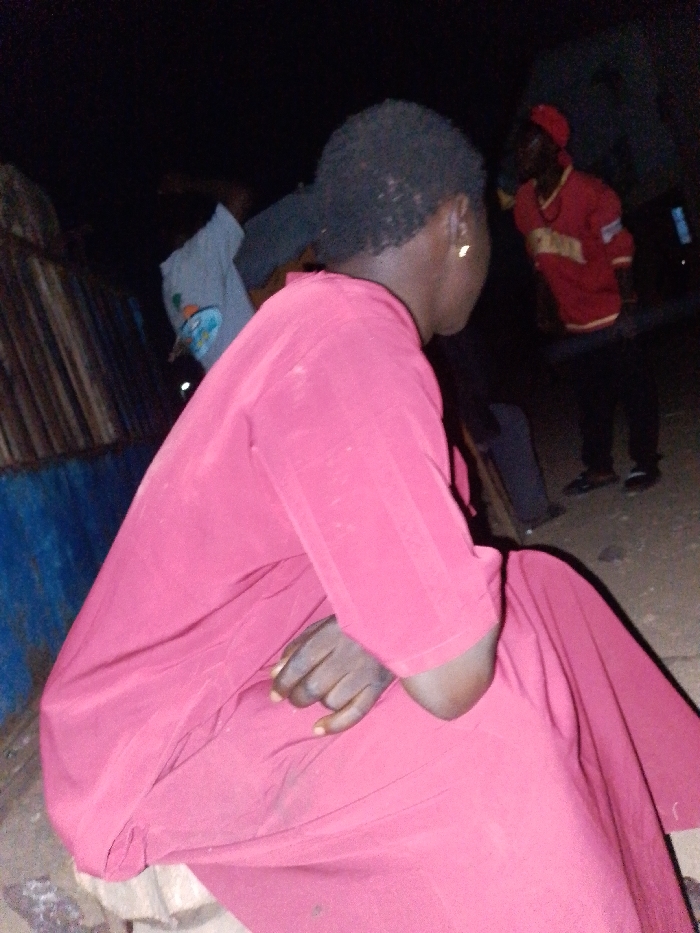 person wearing a red dress with short sleeves, sitting and facing away from the camera. Their dark hair is short, and a gold earring is visible. Two people stand in the background. One wears a light-colored shirt, while the other wears a red shirt and hat. The setting appears to be outdoors at night with limited lighting. There is a fence to the left. The ground looks like dirt or soil.