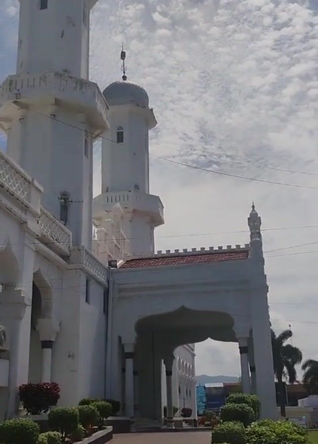 exterior of a white building, likely a mosque, with two minarets. The building features arched windows and columns. There is a walkway leading to an arched entrance. The sky is visible with clouds. Air conditioning units are attached to the exterior of the building.