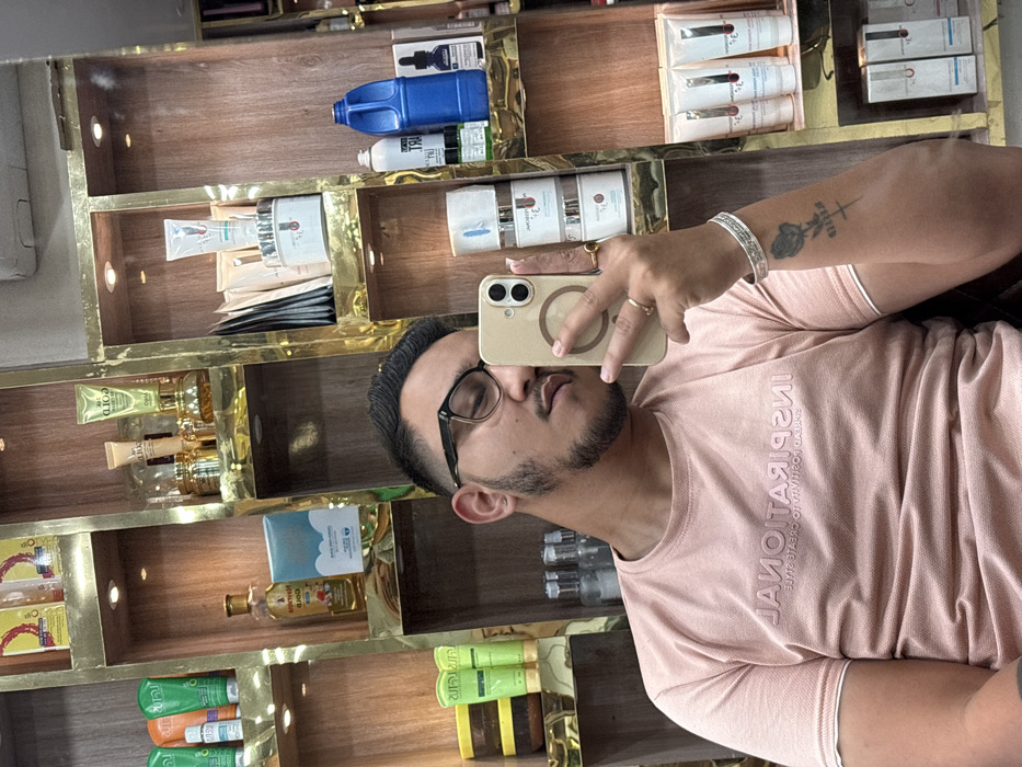 A male subject, appearing to be in his 20s-30s, is captured in a mirror selfie taken inside a salon or beauty supply store located in South Dumdum, India