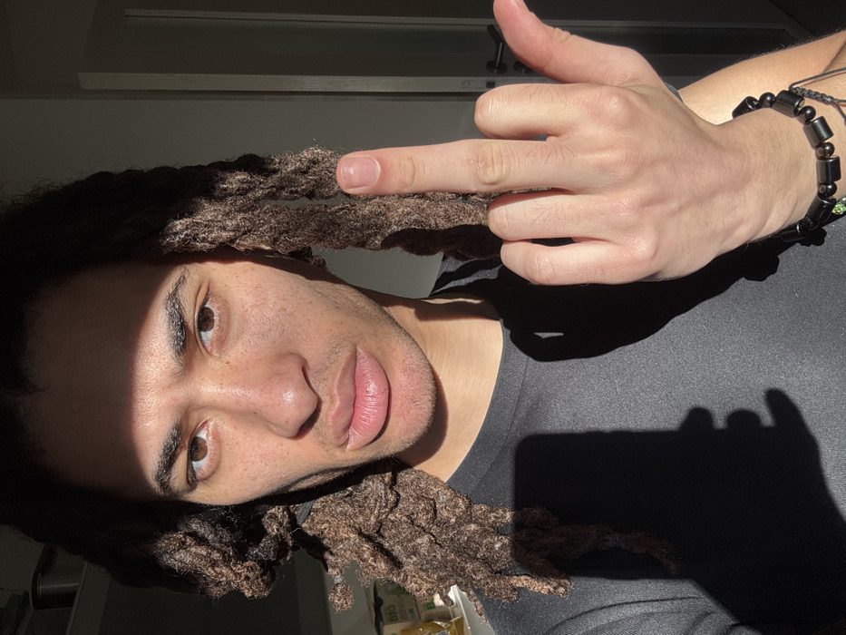 A close-up portrait of an individual, taken in the city of Les Ulis, France, captures the subject from the upper torso upwards. The subject, with medium brown skin and dark dreadlocks, faces directly towards the viewer with a steady gaze and slightly pursed lips. Freckles are visible across their nose and upper cheeks. They are dressed in a plain dark-colored, short-sleeved t-shirt. The subject's right hand is raised to the right of their face, prominently displaying an extended middle finger, signifying a gesture of defiance or insult. The remaining fingers are curled into a partial fist. On the right wrist, a bracelet composed of dark, cylindrical and spherical beads is worn, alongside a smaller green charm attached to a string. The scene is illuminated by strong, directional sunlight, which highlights the right side of the subject's face and upper body, while casting sharp shadows across the forehead, the left side of the face, and much of the torso. The background on the left is blurred, revealing shelves or cabinets with an identifiable white container marked with a "BIO" label. To the right, a white door with a silver handle is partially visible, partially obscured by shadow.