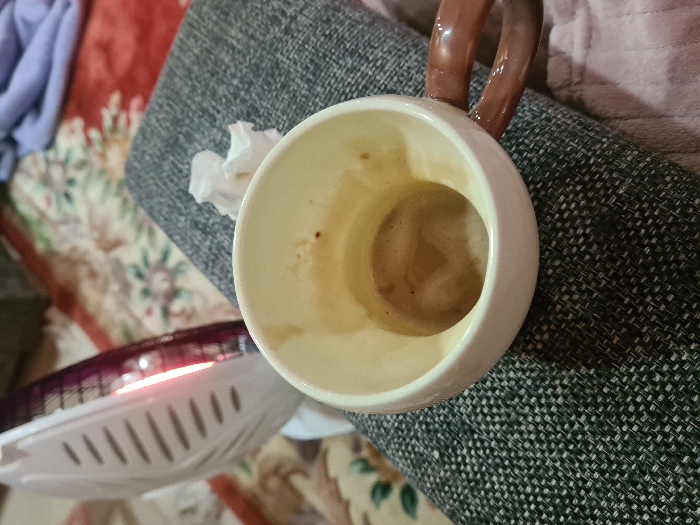 An indoor scene in At-Tall, Syria, features a cream-colored ceramic mug with a brown handle positioned on a dark gray, textured fabric surface. The mug contains residual light brown liquid with foam and exhibits interior staining. Adjacent to the mug on the same surface is a crumpled white tissue. In the background, a white electric fan heater is active, indicated by a glowing red heating element. A patterned rug with floral motifs in red, cream, and green colors is visible behind these items. A light purple fabric item is partially visible on the right, resting on a red portion of the rug.