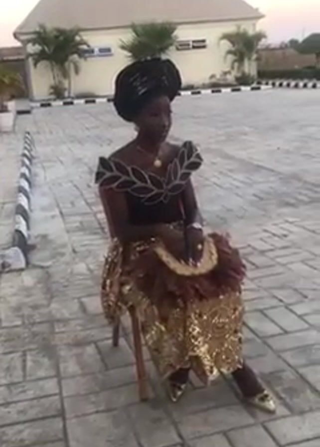 A woman is sitting on a wooden chair in what appears to be a paved parking lot or outdoor area. She is wearing a traditional African outfit, consisting of a black top with decorative leaf-like patterns around the shoulders and neck, a gold sequined skirt, and gold shoes. Her head is wrapped in a black headscarf. She holds a circular fan made of brown feathers. The background includes a one-story building with a light-colored roof, some palm trees, and a black-and-white curb. The scene is well-lit, suggesting it is daytime. The woman appears to be posing or waiting for something.