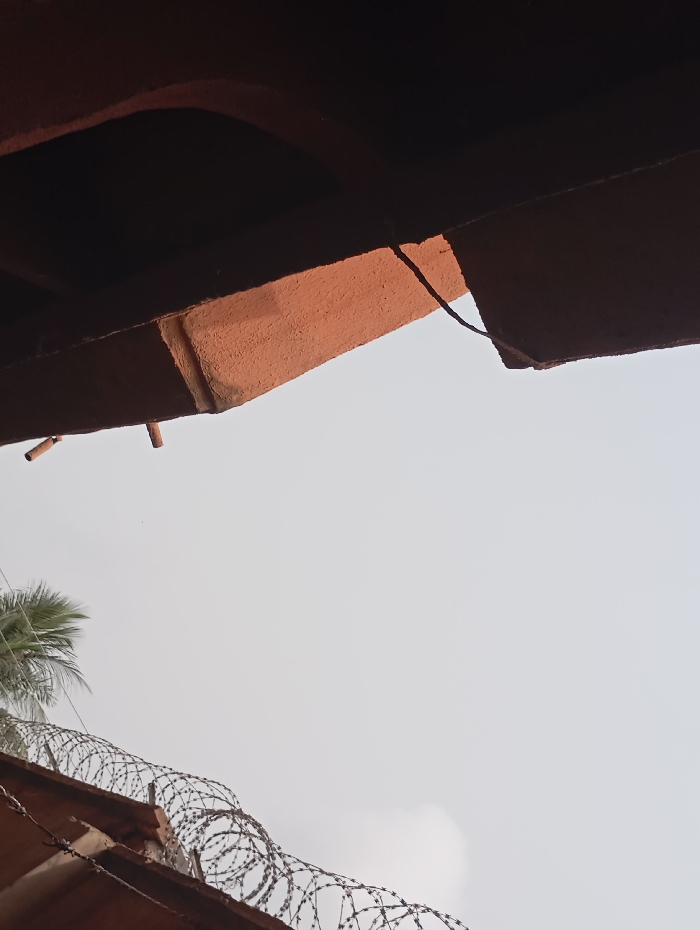 The image depicts an outdoor scene, likely within the vicinity of Akpaka Forest Reser, Nigeria. The foreground is dominated by the underside of a dark, reddish-brown architectural overhang, possibly an eaves or a roof structure, with visible joists or supports. A thin, dark electrical wire is suspended from this overhead structure. Small, dark cylindrical objects, possibly exposed rebar or pipe ends, protrude from the underside of the overhang in the lower left. Below and to the left of the overhead structure, coils of razor wire are prominently displayed atop a lower brown structure, likely a wall or another roof. A portion of a green palm tree is visible behind the razor wire in the upper left quadrant. The background consists of a uniformly light grey sky, suggesting either an overcast condition or atmospheric haze. No individuals are visible in the scene.