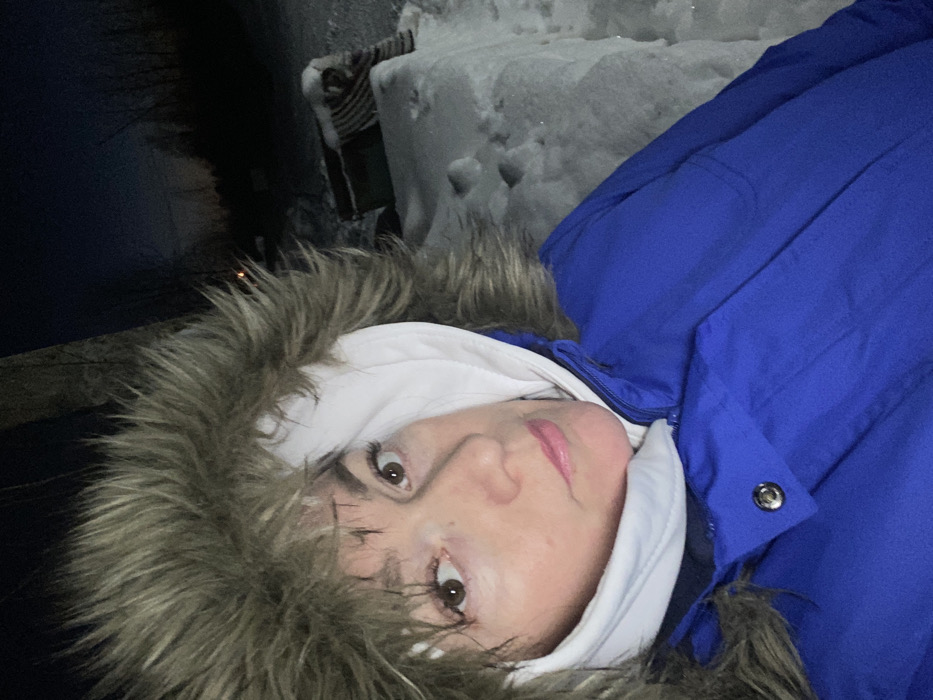 A person wears a blue coat with a furry hood and a white hood underneath. The person's face is visible, with brown eyes and pink lips. In the background, there is a structure covered in snow, along with a glimpse of a striped chair and dark trees. The photograph is taken at an unusual angle.