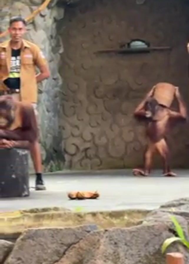 On a stage in what appears to be a zoo or animal park, an orangutan plays with a cylindrical woven basket. Two men in khaki outfits stand on either side of the stage. The orangutan spins and dances, wearing the basket as a hat. The stage is made of gray concrete, and the backdrop is a man-made rock structure that forms a cave-like alcove. The front of the stage is lined with vegetation and rock formations. One man holds a microphone and appears to be addressing an audience. The other orangutan is sitting to the left of the stage.