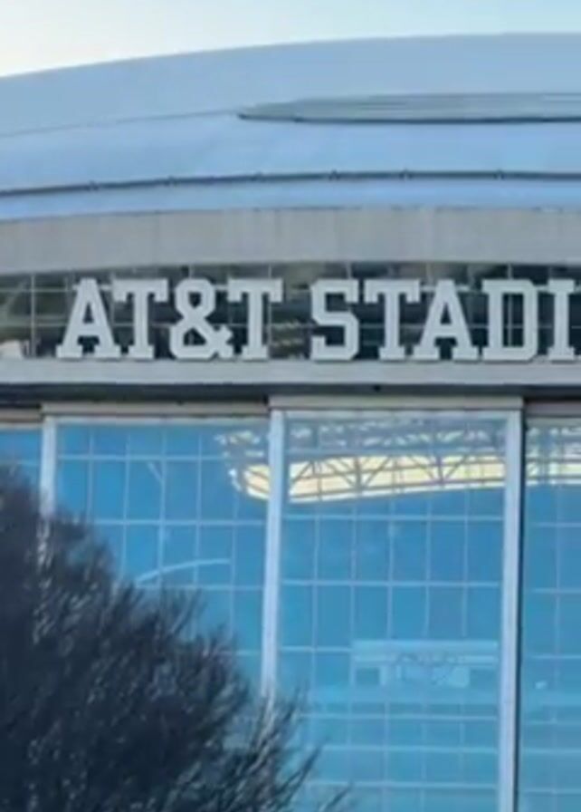 exterior of AT&T Stadium, home of the Dallas Cowboys. The stadium has a large sign with its name, "AT&T STADIUM," displayed prominently. The building has a glass facade and a rounded roof. A man walks in front of the stadium. There are some trees and metal barricades in the foreground. The sky is clear and blue.