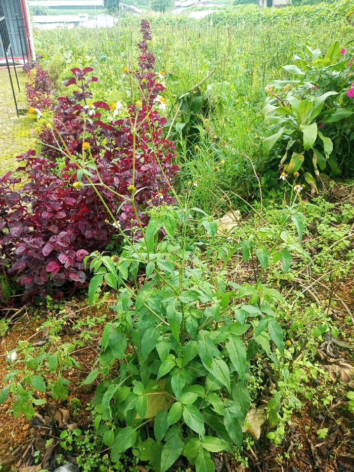 This image depicts an outdoor vegetated scene in Irupalai, Sri Lanka. The foreground is dominated by green leafy plants, exhibiting small white petals with yellow centers, consistent with *Bidens pilosa*, and interspersed with bare earth and smaller green foliage. To the left, a linear arrangement of dense, dark red/purple-leafed plants is present, bordering what appears to be a cleared area or pathway. A section of a building with dark window frames or security bars is partially visible in the upper left background, adjacent to the red-leafed plants. Further into the midground and background, dense green vegetation, potentially cultivated fields or wild growth, extends to the horizon under an overcast sky. Scattered distant structures are discernible on the horizon. No individuals are present, and no specific actions or interactions are depicted.