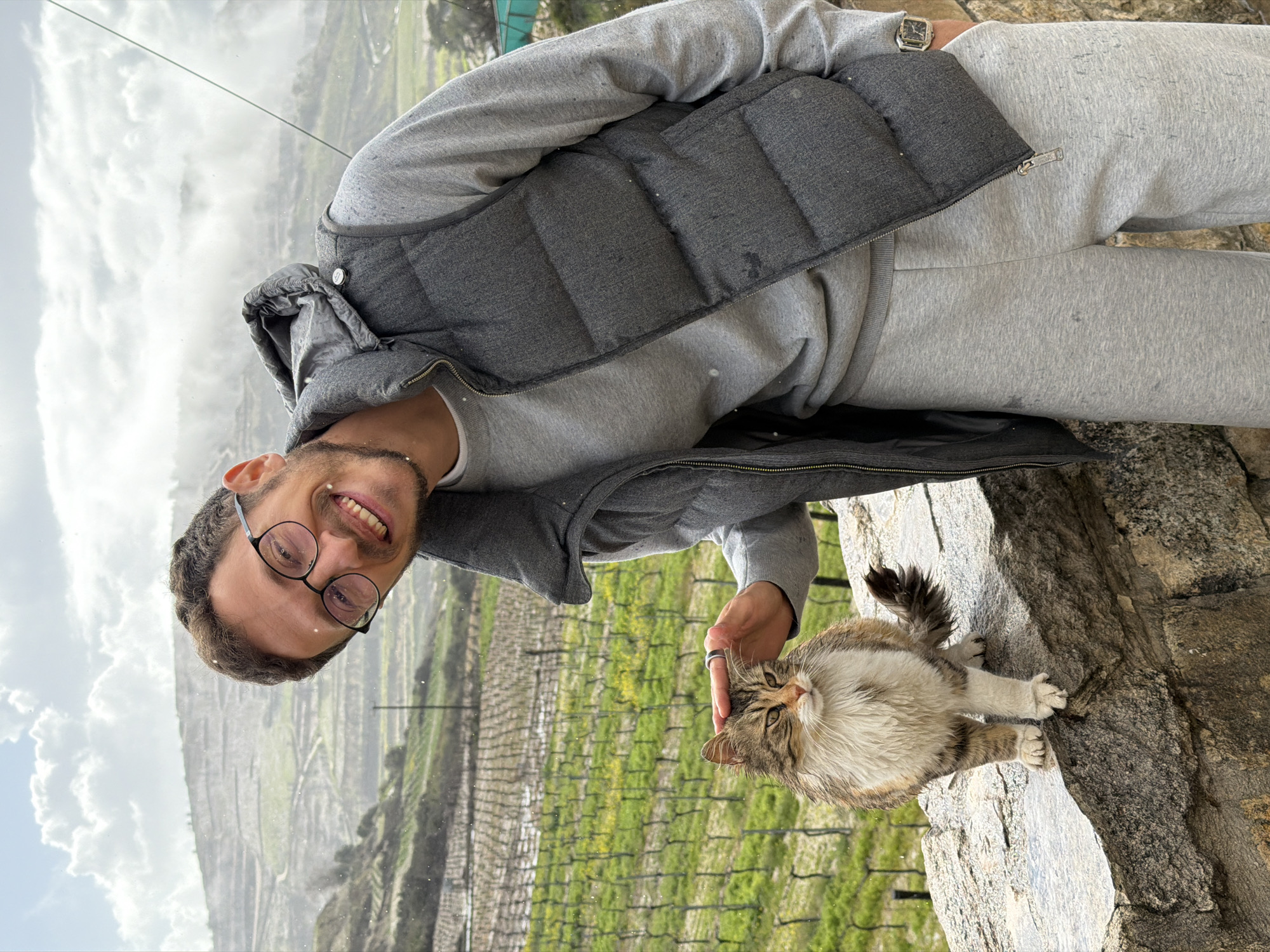 A man with glasses is seen in an outdoor setting in the city of Omodos, Cyprus. He is wearing a grey sweatshirt, matching sweatpants, and a grey vest. He is smiling and petting a cat, which is sitting on a stone surface. In the background, there is a vineyard. The sky is overcast.