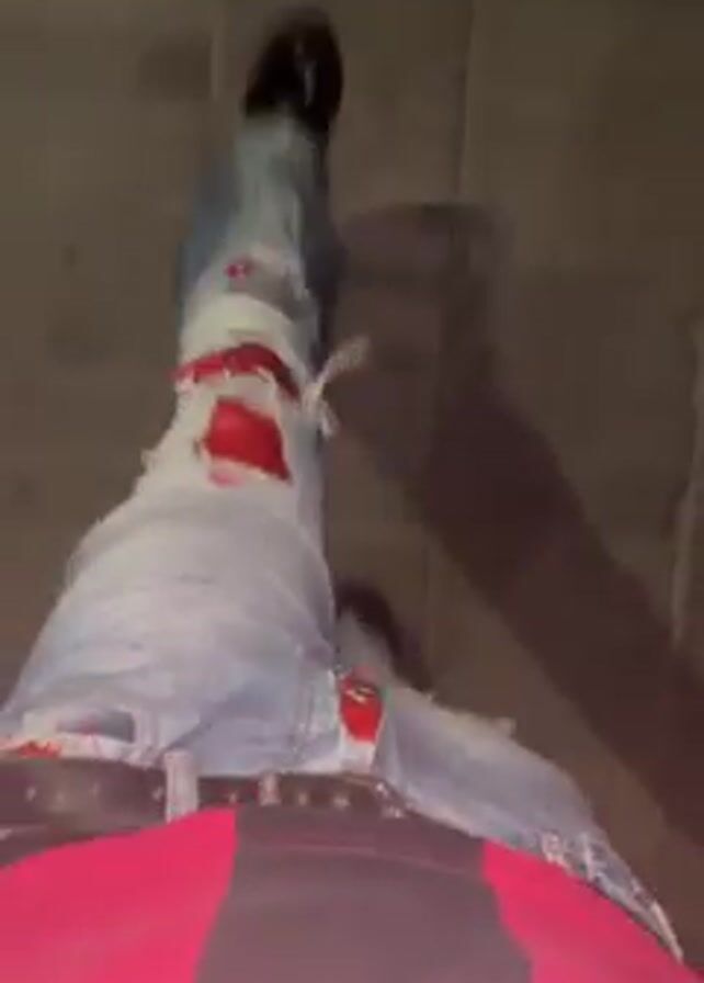 Here's a concise description of the video: A person is walking on a concrete surface. The camera angle is from the person's perspective, looking down at their legs. They are wearing ripped light blue jeans with red patches visible under the rips, a pink and black striped top, and black shoes. The concrete surface appears to have lines or seams. The lighting in the video is dim.