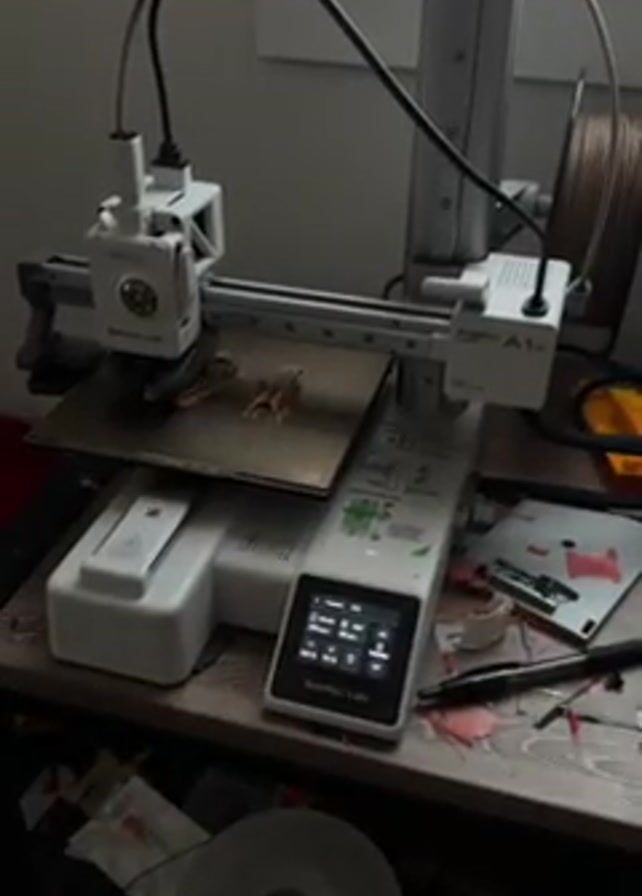 - "Bambu Lab A1 Mini 3D printer printing two small, brown objects on its gold-colored print bed" by FM-kos3F2, licensed under CC BY 4.0