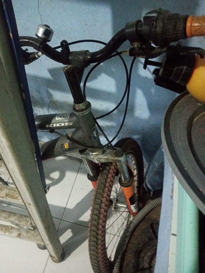 The scene is an indoor or covered area in Balapur, India. A dark gray "KIDS RANGER" bicycle is positioned against a light blue, textured wall, facing forward. The bicycle features black handlebars with a silver bell on the left, and black and orange grips with brake levers on the right. The front fork has silver components and orange lower legs, supporting a reddish-brown knobby tire on the front wheel. To the immediate left of the bicycle, a light-colored metal A-frame ladder stands vertically, partially obscuring the bicycle's frame. The floor is covered with white tiles and dark grout lines. On the right side of the frame, a dark, round object partially obscures the lower portion of the bicycle's front wheel, with a yellow-orange item near the right handlebar and a light blue-green vertical surface farther right. A corrugated tube is visible on the floor at the bottom right. No individuals are present.