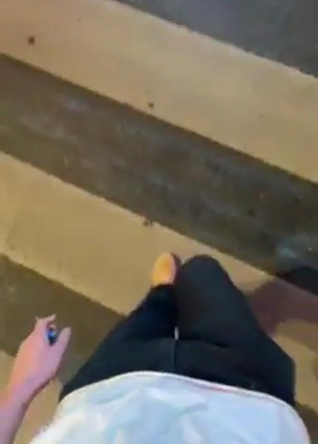 A first-person perspective video shows a person walking across a crosswalk at night. The person is wearing black pants, light brown shoes, and a white shirt. They are holding a small object in their left hand. The crosswalk is made of black and white stripes. The lighting appears to be from streetlights or nearby buildings. The street appears to be wet.