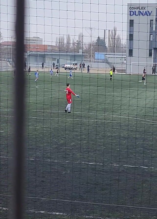 From behind a fence, a soccer game is underway on an artificial turf field. Players wearing blue and black uniforms compete, observed by a referee in a yellow uniform. A goalkeeper in red stands ready. In the background, a gray building with the words "COMPLEX DUNAV" is visible, along with other structures and leafless trees against an overcast sky. Spectators are present along the sidelines. The scene is captured with a slightly shaky camera.