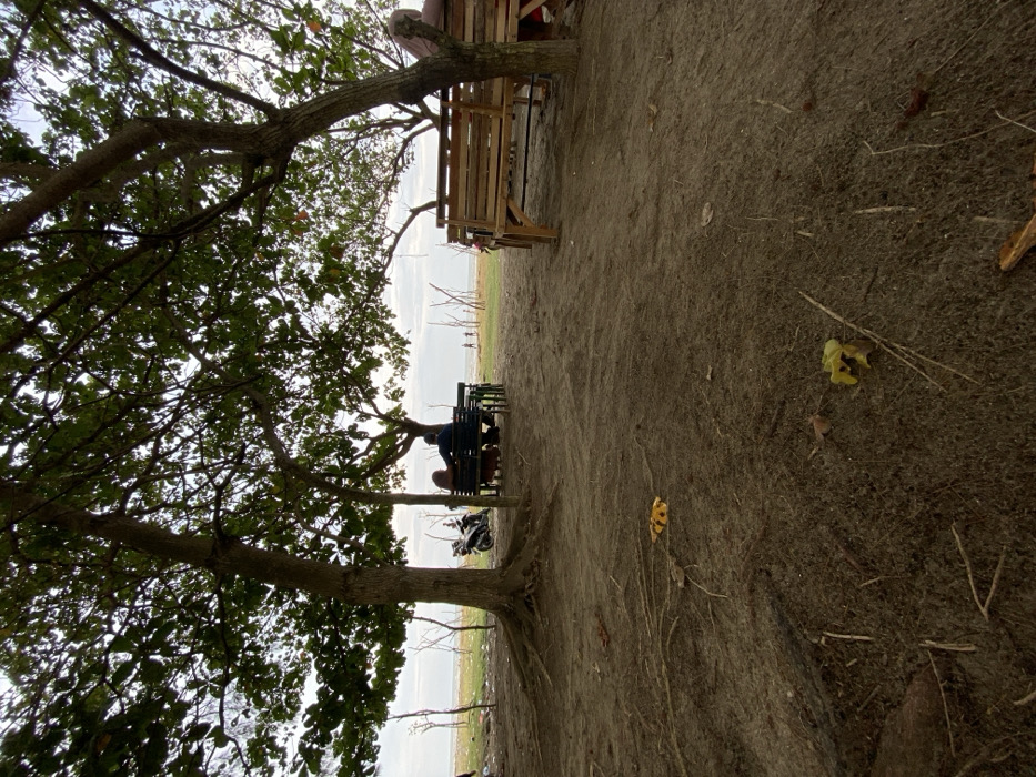 The scene depicts an outdoor recreational area in Kualaidi, Indonesia, under an overcast sky. The foreground consists of dark sandy earth with exposed tree roots and scattered yellow foliage debris. Several mature trees with dense green canopies frame the central view, providing shade. In the midground, towards the left, two individuals are seated at a dark wooden table with attached benches, positioned with their backs to the camera, facing the distant water. One individual appears to wear a head covering. Immediately behind their seating area, a white scooter-style motorcycle is parked. To the right, a lighter wooden bench is partially visible, occupied by a single individual, also with their back to the camera, wearing a light-colored head covering. Beyond the shaded area, a strip of open ground, sparsely covered with vegetation, extends to a body of water. Several small, indistinct human figures are visible near the water's edge in the far distance. The sky above the water is a pale, diffused grey, indicative of overcast conditions.