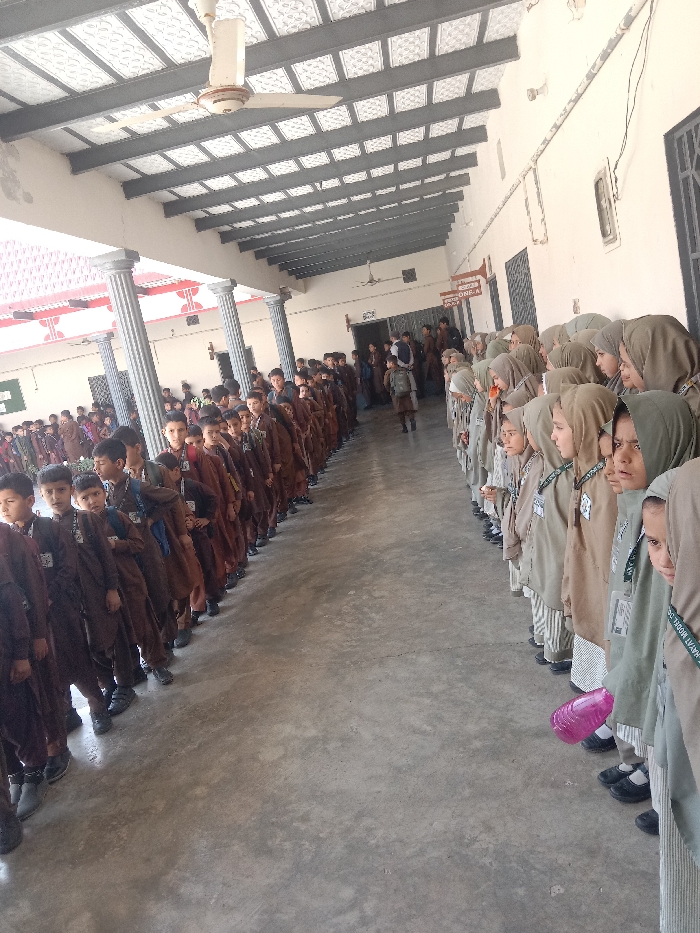 The image displays a school hallway or covered veranda in Quetta City Tehsil, Pakistan