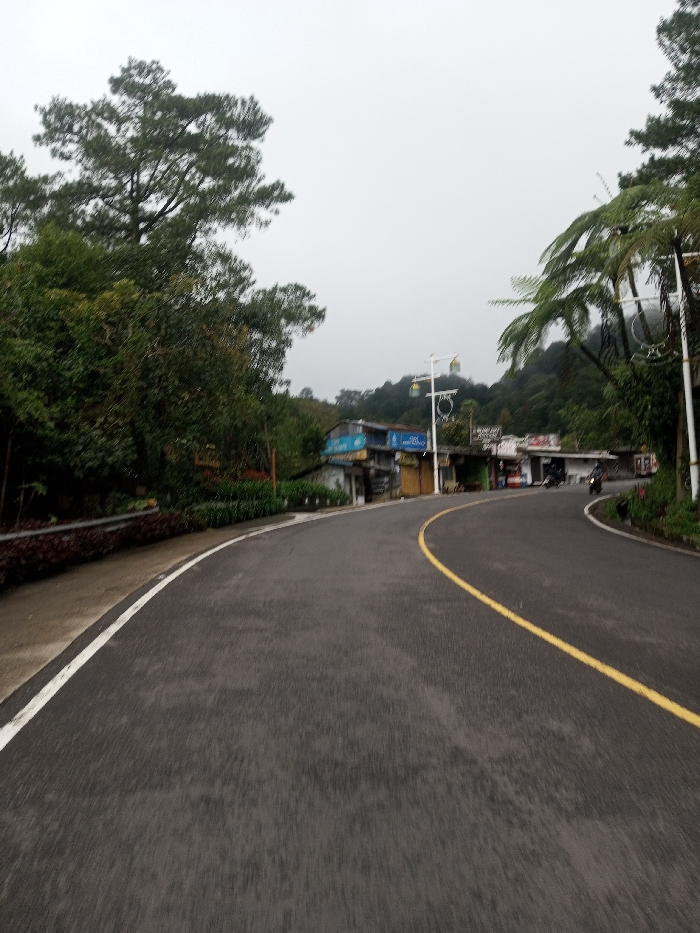 The image depicts a two-lane asphalt road curving to the right in the city of Bangtsho, Bhutan, under an overcast sky. The road features a continuous white line on its left edge and a continuous yellow line marking its center. The asphalt surface appears damp. To the left of the road, a narrow paved shoulder abuts a raised planter containing dense red and green low-lying vegetation. Beyond this, a steep, heavily forested embankment with numerous tall green trees, including a prominent conifer, rises. Further along the curve, partially visible behind the foliage, are several single-story buildings, likely commercial, displaying various facade colors and some closed roller shutters. To the right of the road, dense green foliage, including large fern-like plants, is present. A white decorative street light pole with multiple arms, spherical and circular motifs, and yellow-cased light fixtures stands vertically. Beyond this, more single-story buildings line the roadside. Two motorcycles, one dark-colored, are visible on the right side of the road, oriented away from the viewer. The background features a prominent, heavily forested mountain range rising behind the structures, partially obscured by mist or low clouds. The sky is uniformly gray and overcast. No discernible people are visible.