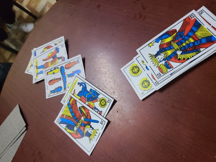 The image presents a high-angle view of a brown table surface. Scattered across the table are multiple playing cards from a Spanish-suited deck. In the lower right foreground, a stack of face-up cards is visible, topped by a 'Rey' (King) of 'Bastos' (Clubs) card numbered 12. To the left, two prominent face-up cards include a 'Rey' (King) of 'Espadas' (Swords) numbered 12, positioned alongside a 'Caballo' (Knight) of 'Oros' (Coins) numbered 11. In the central area, a cluster of approximately five additional face-up cards displays various suit symbols, including a '10' of 'Espadas' (Swords) and other cards from the 'Bastos' (Clubs) and 'Oros' (Coins) suits. A stack of grey-backed, face-down cards rests in the upper left corner of the table. In the upper right background, a partial view of a human leg and a white shoe is discernible, indicating the presence of an individual seated at the table. The scene is located in the city of Fez, Morocco.
