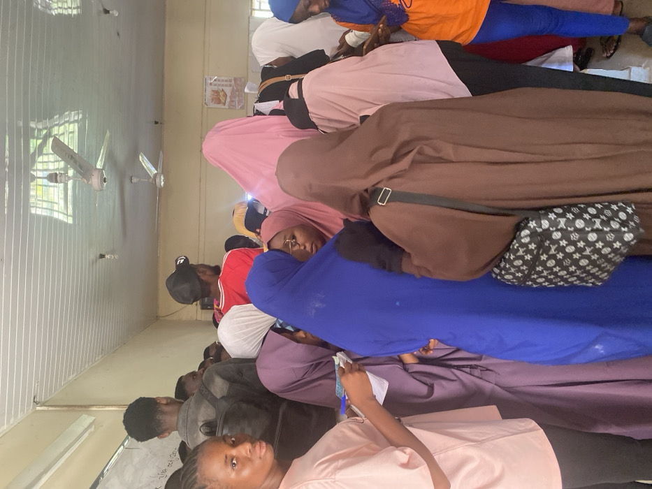 The image depicts a crowded indoor scene, identified as an educational or public gathering space within the city of Dabawa, Nigeria