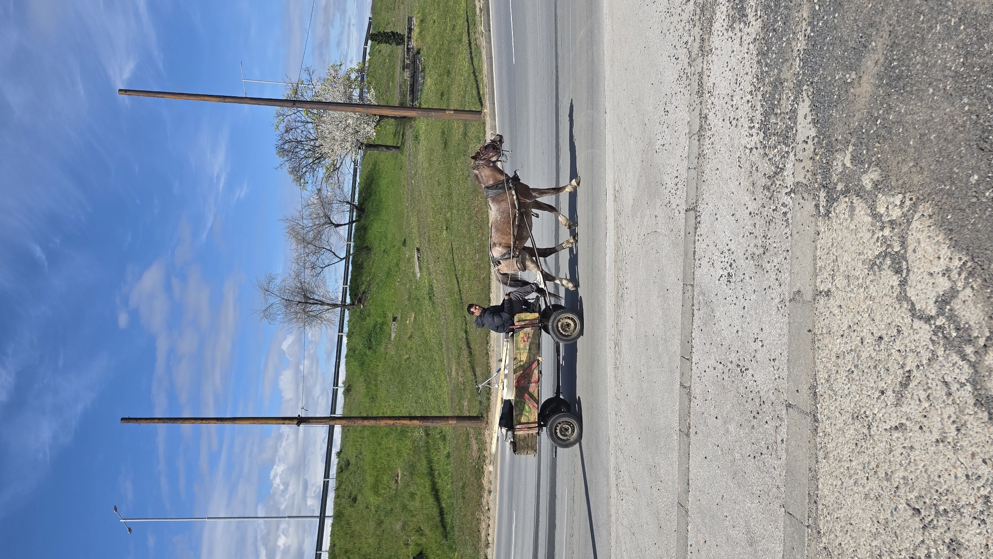 A horse-drawn cart with a driver is traveling on a paved road adjacent to a grassy area with trees. The sky is blue with scattered clouds. The scene is likely located in an area with a mix of urban and rural elements, potentially on the outskirts of the city of Blagoevgrad, Bulgaria.