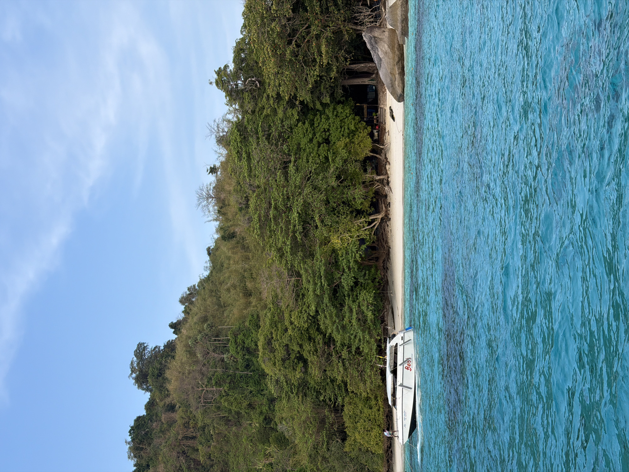 - "An outdoor scene depicts a white speed boat anchored near a white sand beach adjacent to a heavily vegetated island" by FM-kRQMq1, licensed under CC BY 4.0