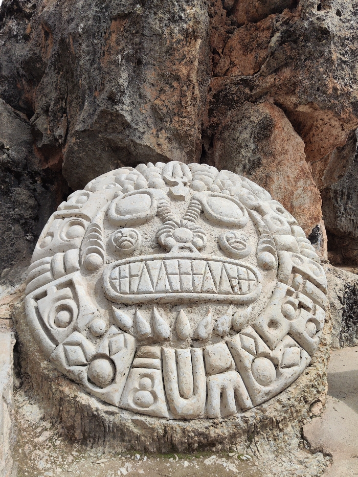 - "A circular stone carving depicting a monstrous face is displayed against a backdrop of rock formations" by FM-20kwN2, licensed under CC BY 4.0