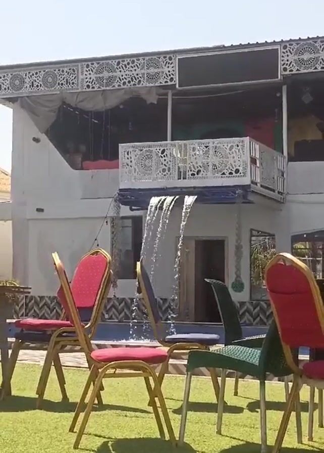 two-story white building with a decorative roof and balcony. Water is flowing from the balcony into a small pool below, creating a small waterfall effect. Several chairs are arranged on a green lawn in front of the building. The chairs have red and gold frames, with some also having green frames. The sky is bright and clear. There is no evidence of any people.