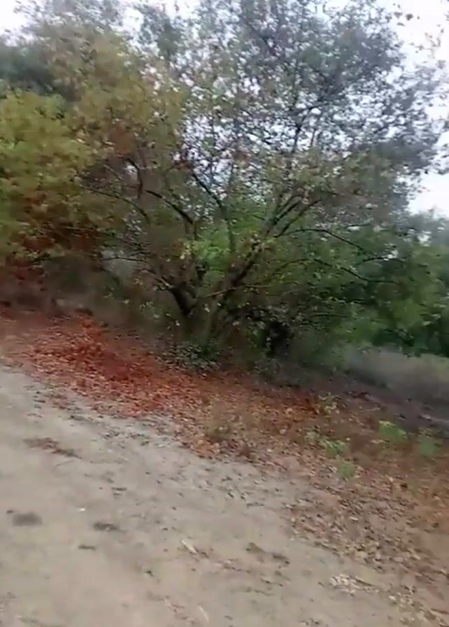 ground-level view of a dirt road or path leading into a forested area. The ground is covered in fallen leaves. On the right side of the path, there's a dense grouping of trees and shrubs with some reddish foliage mixed in. As the camera pans to the right, a large tree with sparse green leaves becomes prominent. Behind the tree, in a field, a white, tarp-covered structure or object is visible. The sky appears overcast. The camera continues to pan, showing the base of the tree and more of the leaf-covered ground.