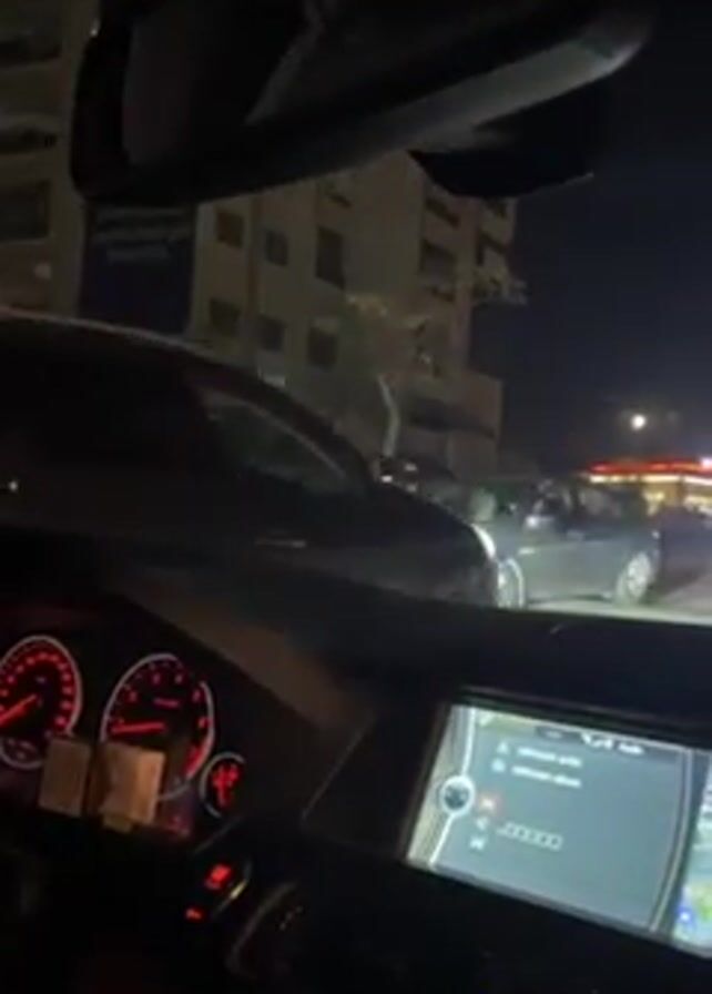 The camera, situated inside a car, captures a night-time street scene. Other vehicles are visible on the road, and building lights illuminate the surroundings. The driver seems to be navigating city streets. The car's dashboard is prominently displayed, showing the speedometer and infotainment system, which features a map and audio player. Music plays in the background throughout the recording.